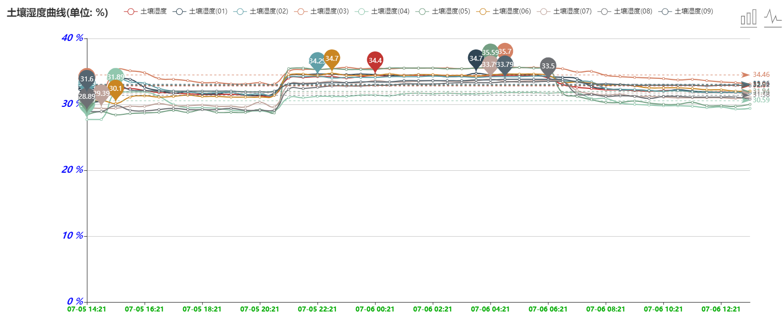 7、用戶可以隨時(shí)通過手機(jī)和計(jì)算機(jī)遠(yuǎn)程查看、下載數(shù)據(jù)。軟件可以查看最高值、最低值、平均值。用戶可根據(jù)土壤水分和電導(dǎo)率、氮磷鉀養(yǎng)分的數(shù)據(jù)變化來分析土壤各個參數(shù)之間的關(guān)聯(lián)性和相互影響。