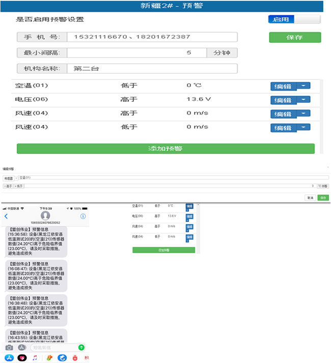 5、預(yù)警設(shè)置:首先啟用預(yù)警設(shè)置并通過添加手機(jī)號,短信推送了解何種氣象出現(xiàn)報警??商砑佣鄠€手機(jī)號多人來管理。傳感器設(shè)置:點擊編輯按鈕出現(xiàn)圖2,在圖2中根據(jù)實際情況設(shè)置各傳感器的預(yù)警值,并點擊保存即可。最后點擊添加預(yù)警按鈕,即為預(yù)警設(shè)置成功。詳見如下: