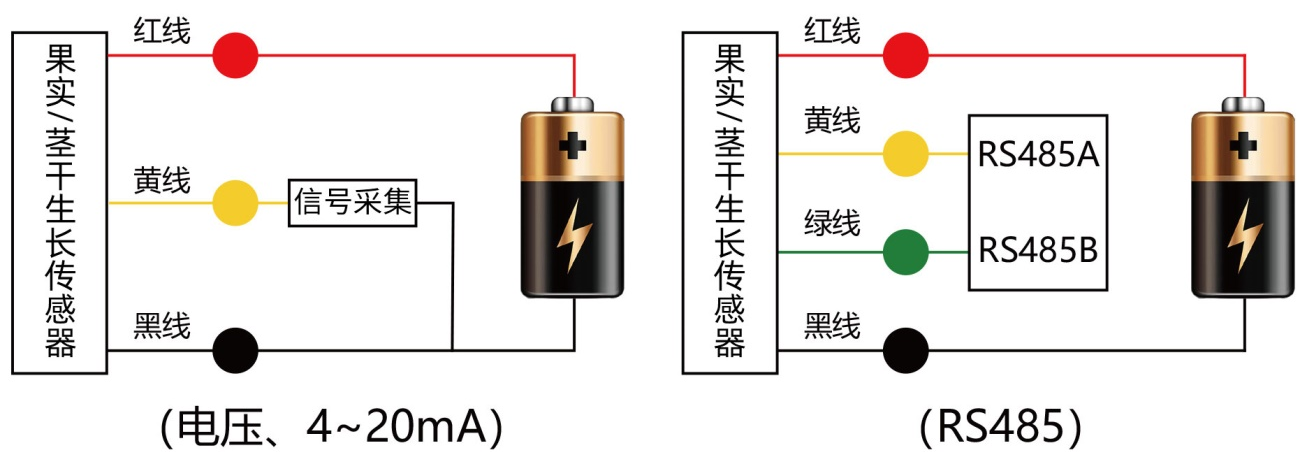 果實(shí)/莖干生長傳感器可連接各種載有差分輸入的數(shù)據(jù)采集器,數(shù)據(jù)采集卡,遠(yuǎn)程數(shù)據(jù)采集模塊等設(shè)備,接線說明如下圖: