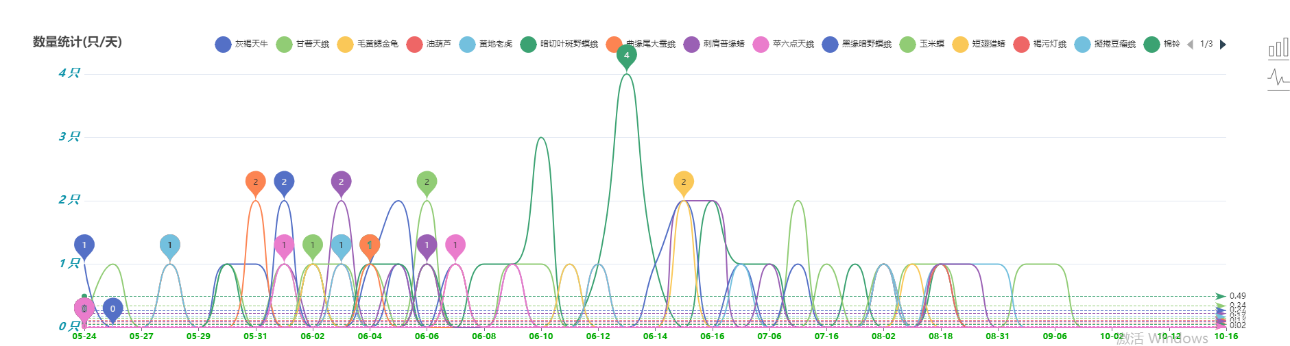 5、蟲(chóng)害統(tǒng)計(jì)功能。針對(duì)不同品種害蟲(chóng)識(shí)別結(jié)果歷史數(shù)據(jù),可選擇一定時(shí)間范圍內(nèi)數(shù)據(jù)查詢統(tǒng)計(jì),通過(guò)圖表形式顯示??蛇x任意害蟲(chóng)種類,直觀看出發(fā)生的蟲(chóng)害種類和數(shù)量,從而判斷其危害程度。